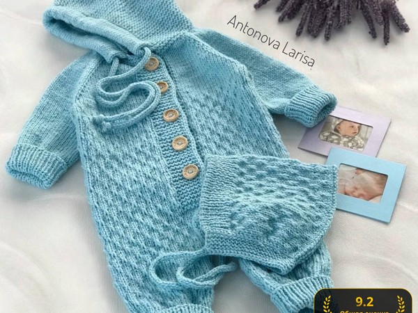 Какое очаровательное нежно-голубое чудо! На фото мы видим уютный детский комбинезон с капюшоном и аккуратными деревянными пуговками, дополненный милой шапочкой-боннетом. Рельефный узор сотами дарит интересную текстуру и воздух, а плотные резинки по манжетам и ножкам обеспечивают идеальную посадку и тепло. Капюшон связан платочной вязкой, благодаря чему отлично держит форму и подчёркивает мягкие детские черты. Сдержанная пастельная палитра создаёт ощущение легкости облачка, а аккуратная фотокомпозиция с веточками лаванды и снимками малышей придаёт работе тёплое, домашнее настроение.