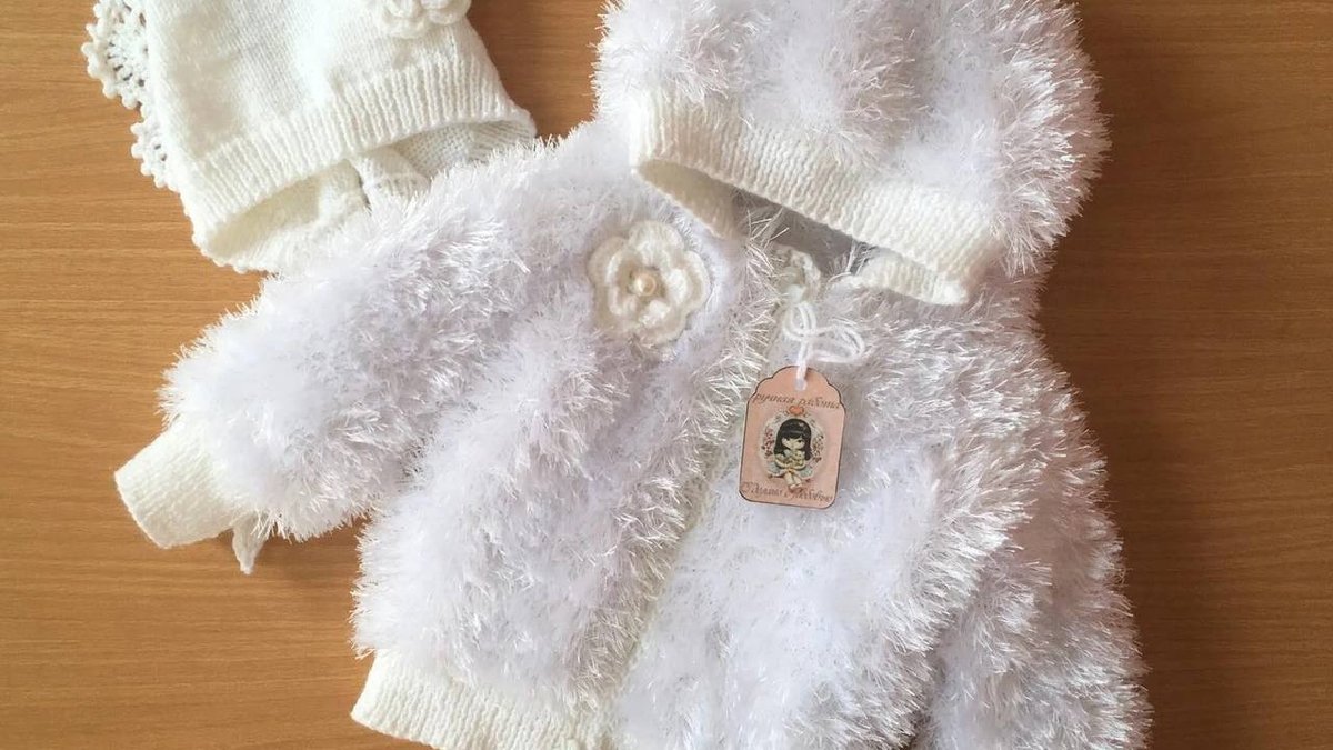 Нежный детский комплект «на выписку»: пушистая кофточка из пряжи «травка» в молочно‑белой гамме и две шапочки — гладкая и чепчик с ажурной каймой. Манжеты и планки связаны ровной резинкой, за счёт чего изделие держит форму и выглядит аккуратно. Декор в виде цветка добавляет «нарядности», а фактура пушистой нити даёт эффект облачка. Работа добротная и уютная, но из-за ворса качество петель читается хуже, а дизайн скорее классический, чем авторский.