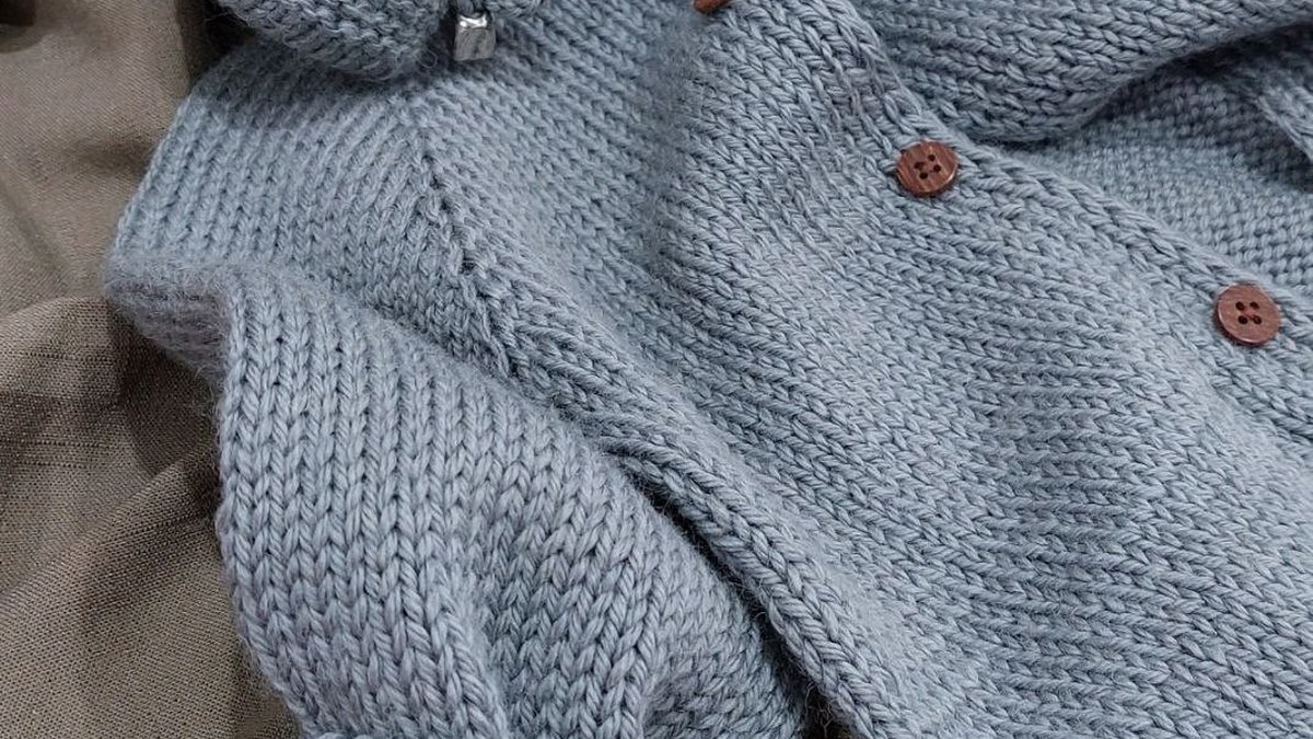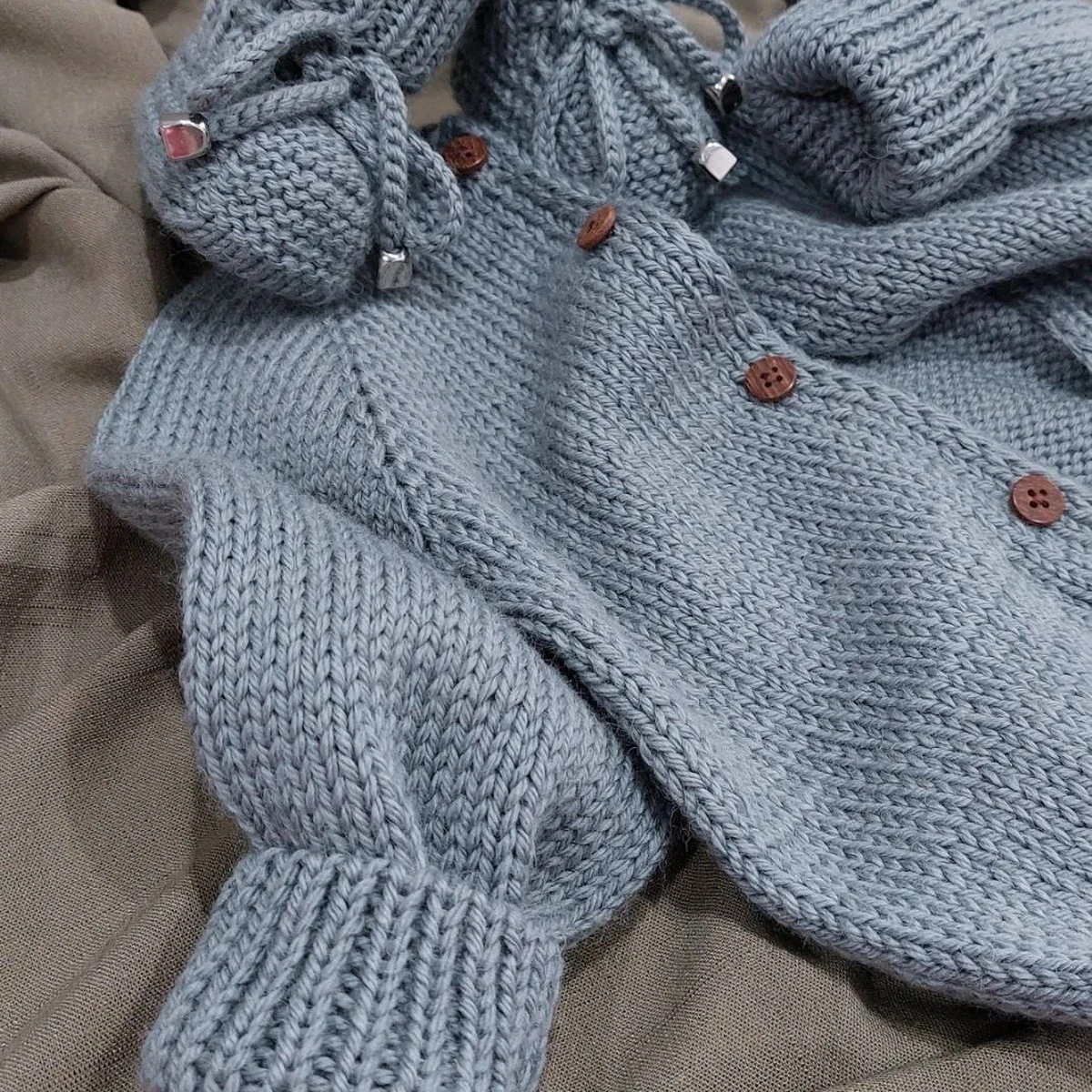 Нежный комплект для малыша в благородном пыльно-голубом оттенке: кофточка на пуговицах с аккуратными манжетами резинкой и ровной лицевой гладью, плюс тёплые пинетки с кулиской/шнурком и дополнительные аксессуары в том же стиле. Вязка выглядит уверенной: полотно гладкое, резинки держат форму, сборка в целом чистая. Дизайн классический и практичный — отличный базовый набор на выписку или в коляску, особенно в прохладный сезон.