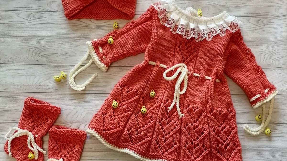 Очаровательный малышковый комплект из коралловой мериносовой пряжи: ажурное платьице с лифом лицевой гладью и роскошным клиновидным узором «листья» по подолу, дополненное контрастной молочной обвязкой «рачий шаг» и тонким I-cord шнурком на талии и манжетах. Украшение – воздушный кружевной воротничок и весёлые смайлик-пуговки. Тюрбан-чепчик связан узором «рис» и собран в эффектный бантик, подчеркнутый малюсенькой ромашкой. Носочки-следочки повторяют ажур платья и фиксируются шнурками. Комплект смотрится нежно, нарядно и очень современно, идеально подойдёт для фотосессии или торжества.