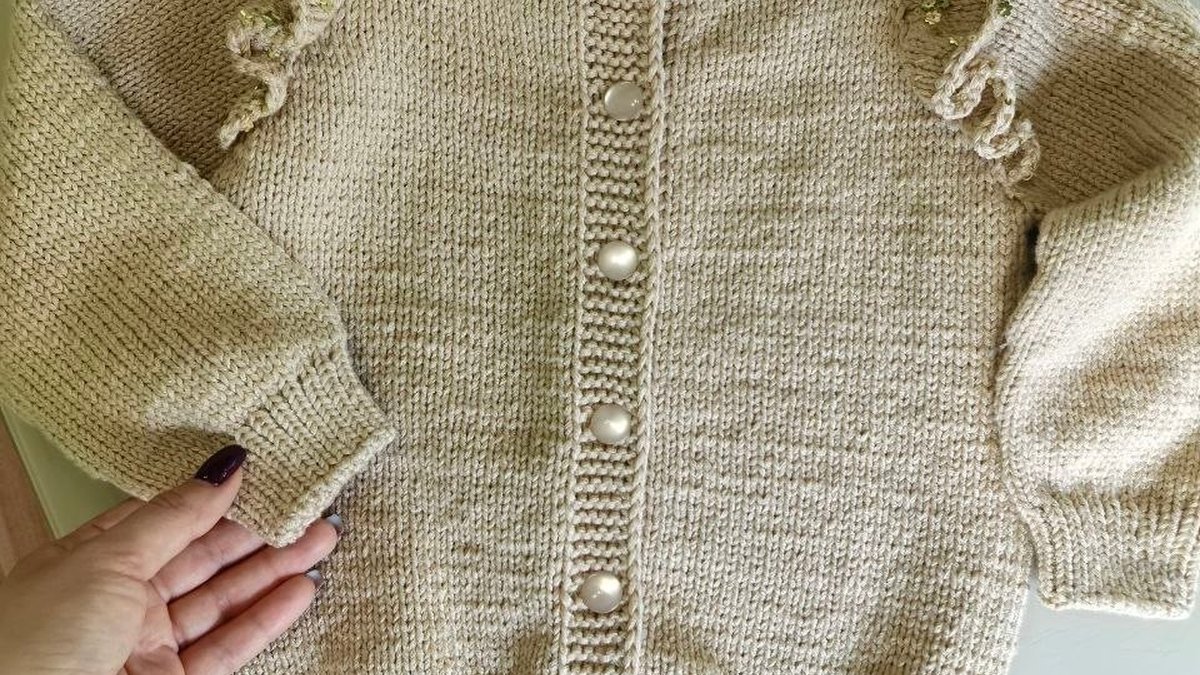 Нежный детский кардиган в тёплом бежевом оттенке смотрится аккуратно и «дорого» за счёт лаконичного силуэта и выразительных воланов по линии реглана. Основное полотно связано ровной лицевой гладью, планка — платочной вязкой, застёжка на крупные пуговицы добавляет уютной ретро-нотки. Манжеты и низ выполнены резинкой, посадка выглядит комфортной и практичной для ребёнка. В целом работа крепкая, с хорошей базовой техникой и приятным, носибельным характером.