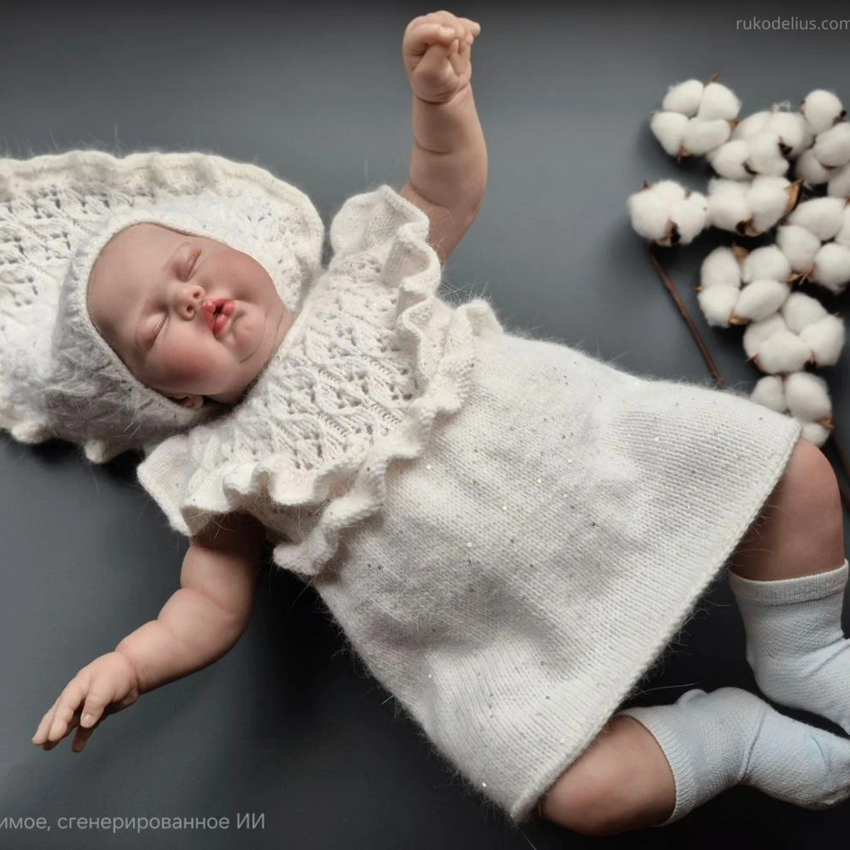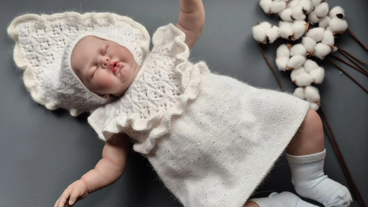 Нежный детский комплект в молочно-сливочном оттенке выглядит по‑настоящему «празднично»: ажурный чепчик с воланами и платьице с ажурной кокеткой создают образ в стиле крестильной классики. Полотно ровное, лицевая гладь чистая, ажур читается аккуратно, оборка лежит красиво и добавляет объёма. Лёгкий деликатный блеск пряжи работает на нарядность, а стилизация с веточками хлопка даёт ощущение воздушности и премиальной подачи.