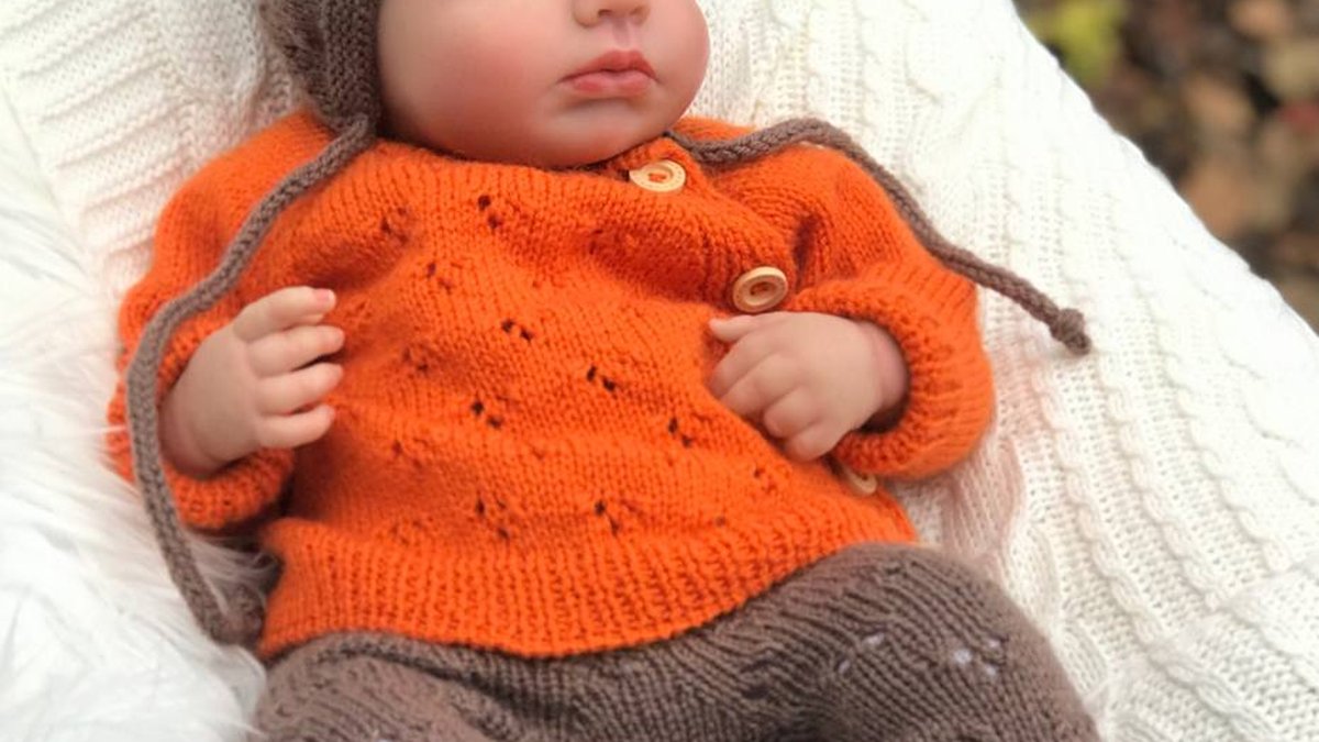 Очаровательный детский комплект из четырёх предметов: ярко-оранжевая кофточка на пуговках с ажурными дырочками, коричневые штанишки с рельефным узором, пинетки-«топотушки» на манжетах с завязками и шапочка с забавными ушками. Стежки ровные, полотно гладкое, аккуратные прибавки по линии реглана и продуманные убавки в шапочке. Гармоничное сочетание тёплого тыквенно-оранжевого и спокойного кофейного оттенка создаёт осеннее настроение и подчёркивает «лесную» тематику. Комплект выглядит уютно и профессионально связанным, отлично сидит на малыше и идеально подходит для фотосессий и прогулок в прохладную погоду.