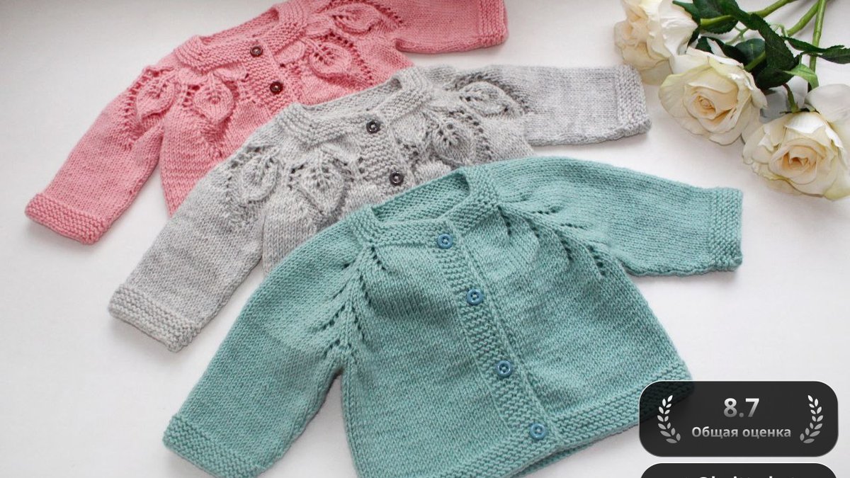 На фото ‑ три очаровательных детских кардигана с цельновязанной кокеткой «листочки»: пудрово-розовый, светло-серый и мятный. Ажурные листики обрамляют горловину, создавая игривый рельеф и подчёркивая круглую форму кокетки. Чёткие ровные лицевые ряды сочетаются с фактурной платочной планкой и манжетами, а маленькие пуговки в тон добавляют завершённости. Гармония нежных пастельных оттенков делает изделия по-настоящему воздушными и подчёркивает аккуратность исполнения. Эти кардиганы выглядят уютно, празднично и одновременно практично, идеально подойдут для фотосессии малыша или в качестве душевного подарка к выписке.