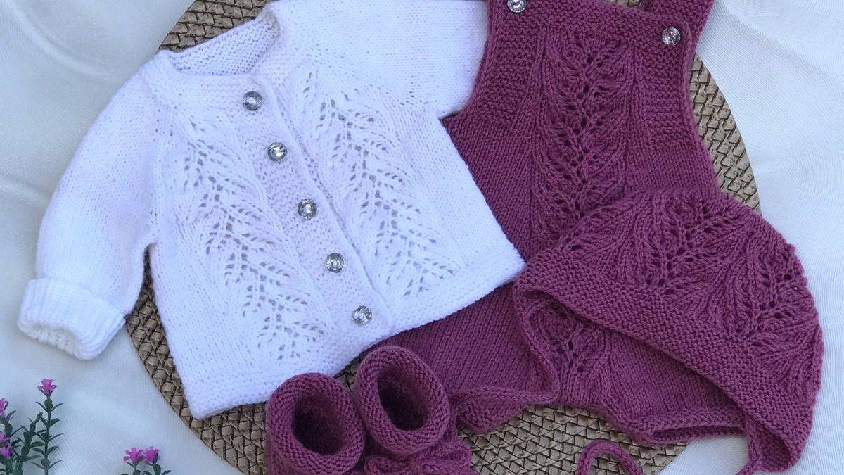 Этот восхитительный комплект для малышей состоит из четырёх предметов: белый вязаный кардиган, розовый комбинезон, шапочка и пинетки. Кардиган украшен красивыми ажурными узорами и блестящими пуговицами. Розовый комбинезон и шапочка выполнены с использованием аналогичного ажурного узора, что придаёт всему комплекту гармоничный и стильный вид. Пинетки дополняют образ, добавляя уют и заботу о малыше. Выглядит очень нежно и прекрасно подойдёт для любого малыша.