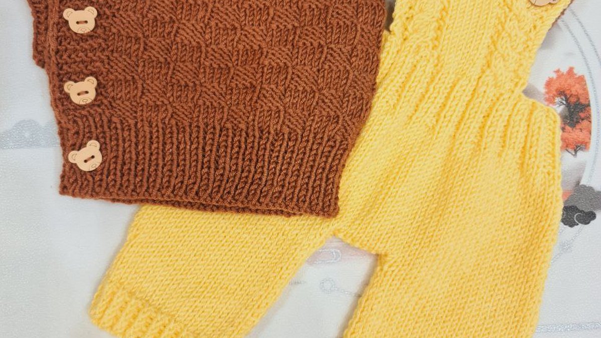 На фото изображены два очаровательных вязанных изделия. Первое — это кофточка коричневого цвета с декоративными медвежьими пуговицами, выполненная из качественной пряжи. Второе — это желтый комбинезон, также украшенный милыми медвежьими пуговицами, который идеально подходит для малыша. Оба изделия выполнены с мастерством и вниманием к деталям, что делает их идеальным выбором для маленьких детей.