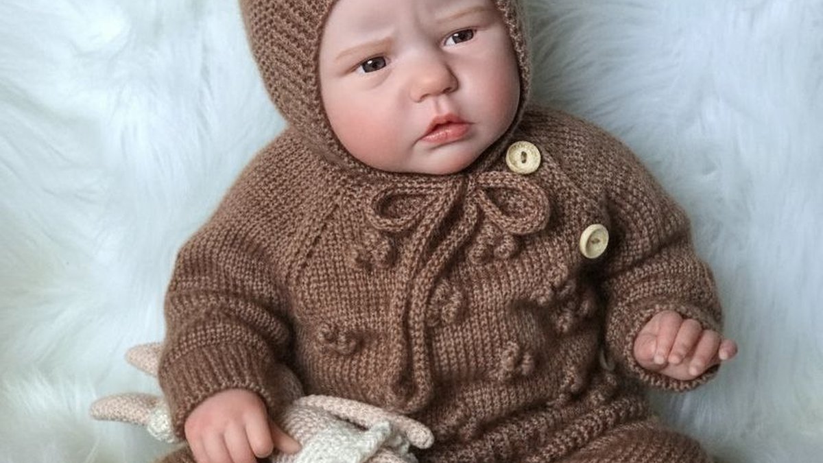 Очень трогательный комплект для малыша: тёплый вязаный костюм в оттенке «какао» и шапочка-шлем с ушками «мишка». Полотно ровное, плотность выдержана, лицевая гладь аккуратная, горловина и планки выглядят чисто обработанными, пуговицы подобраны в тон и не спорят с фактурой. Декор на переде добавляет объёма и «ручного» шарма. В кадре также есть мягкая вязаная куколка/зайка в молочном цвете — приятный компаньон и усиление сказочного настроения. Фото нежное, свет мягкий, изделие отлично читается.