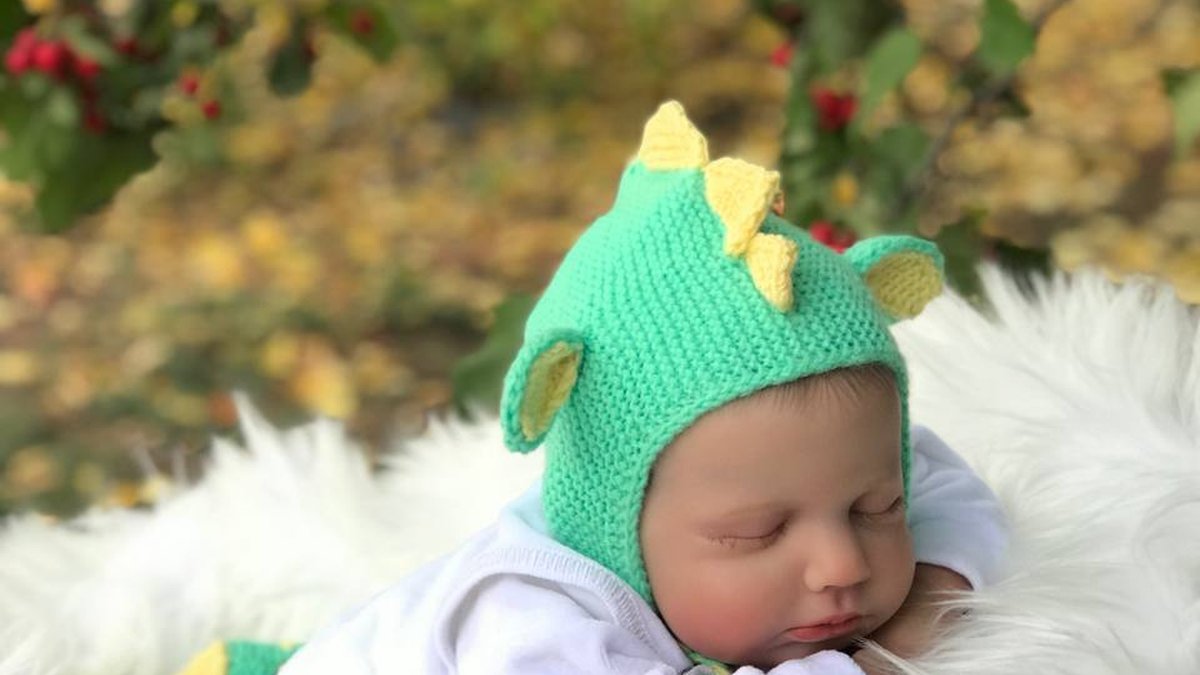 Чепчик связан спицами №3 из тонкой детской пряжи категории Baby DK. Работа начинается с задней части головки: набирается небольшой овал из 6–8 петель, далее полотно расширяется круговыми прибавками до нужного диаметра. После формирования купола вязание переходит на платочную вязку, выполняемую укороченными рядами — это обеспечивает плавный переход к боковым частям и формирует аккуратный вырез лица. Для подчёркнутой упругости кромка лица провязана методом «i-cord» в два сложения нити. Ушки вывязаны отдельно: набраны петли по живым краям, после чего связана маленькая клиновидная деталь с убавками по центру; внутренняя часть ушка выполнена из жёлтой пряжи и вшита потайным матрасным швом. Динозаврьи шипы состоят из мини-треугольников, связанных столбиками без накида крючком №2,5 и набитыми лёгким холлофайбером для объёма. Каждый шип пришит потайными стежками вдоль линии хребта, начиная от макушки и заканчивая кончиком хвоста. Хвост связан по кругу спицами способом «magic loop»: после набора 6 петель выполняются регулярные прибавки, затем часть хвоста провязывается прямо, а ближе к основанию выполнены убавки для естественного изгиба. Хвост наполнен синтепухом и пришит к провязанному поясочку-ленточке платочного полотна. Все детали соединены «петля в петлю» для невидимого шва.