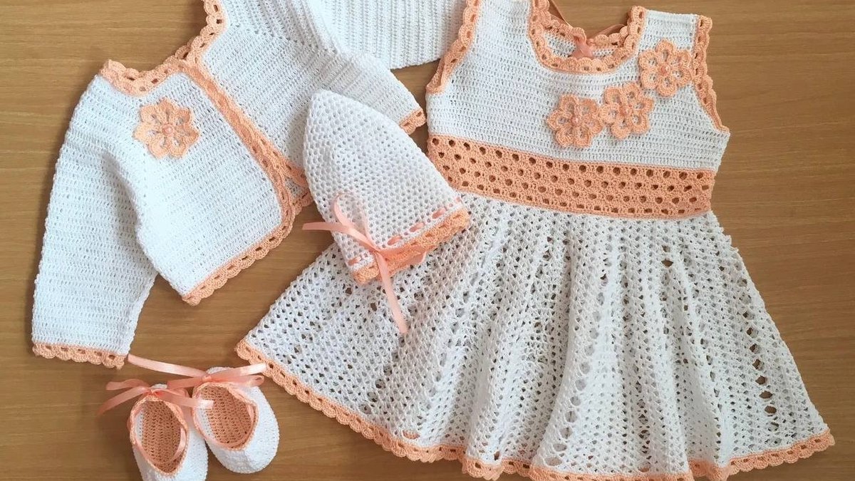 Нежнейший комплект для малышки в бело‑персиковой гамме: ажурное платьице с кокеткой, кофта с аккуратной обвязкой «пико», длинный шарфик, шапочка и пинетки с атласными лентами. Очень приятная «русская школа» крючка — ровные ряды, чистые прибавки/убавки, достойная посадка кокетки и красиво раскрывающийся ажур юбки. Аппликации‑цветочки добавляют нарядности, а единая кайма объединяет все вещи в один образ.