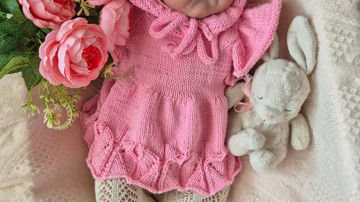 Очаровательный комплект для малышки: лёгкое розово-сиреневое платьице с капюшоном-шлемом, связанное лицевой гладью и украшенное изящным волнистым бордюром с «листочками». Нижний край декорирован широким рельефным узором в виде ромбов и шишечек, который придаёт юбочке приятную фактуру и воздушную сборку. В капюшоне сохранён тот же рельефный край, а мягкие завязки-шнурочки красиво формируют бантик под подбородком. Строчка ровная, петельки аккуратные, плотность изделия выдержана, что особенно важно для детских вещей.