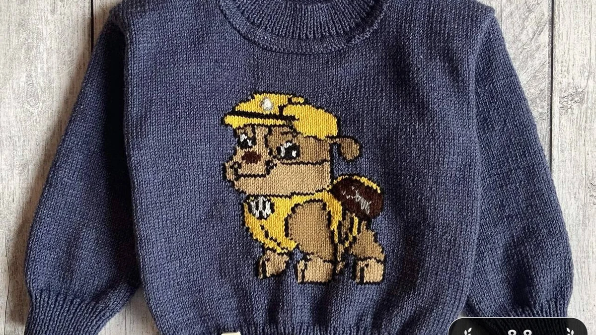На фото — аккуратный детский свитер тёмно-сине-графитового оттенка, выполненный лицевой гладью с широкой резинкой по горловине, манжетам и низу. Главный акцент — крупная интарсия с щенком в жёлтой каске: цвета подобраны контрастно и «читаются» с первого взгляда, образ очень дружелюбный и узнаваемый. Полотно в целом ровное, резинки держат форму, посадка выглядит мягкой и уютной. Снимок удачный: изделие разложено на нейтральном деревянном фоне, всё хорошо видно и без лишних деталей.