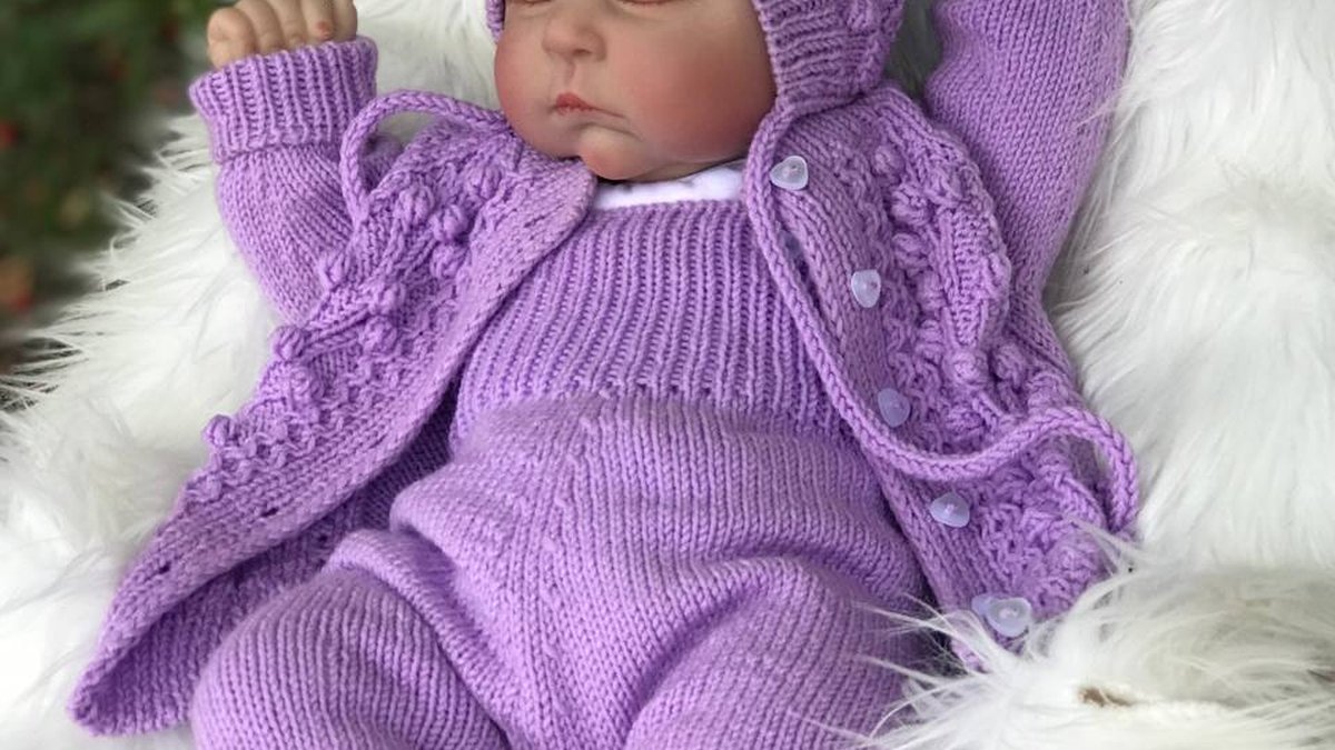 В кадре – очаровательный комплект для новорождённого в нежном сиреневом цвете: фактурная шапочка-чепчик с косами и шишечками, уютный кардиган с теми же элементами, гладко вывязанный боди/джемпер, мягкие штанишки на резинке и миниатюрные пинетки-угги. Единство оттенка создаёт цельный образ «сладкого сна», а повторение узора на шапочке и кофточке придаёт комплекту профессиональную законченность. Петли ровные, плотность стабильная, переходы между деталями аккуратные, пуговки удобно застёгиваются. Работа выглядит нежно, приятно на ощупь и явно выполнена с любовью.