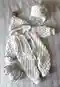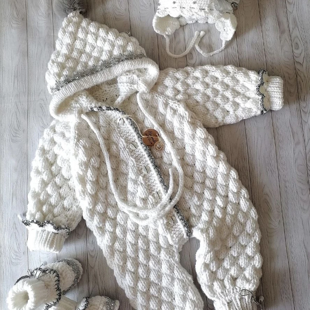 Нарядный зимний комплект для малыша в молочно‑белой гамме: объёмный комбинезон с капюшоном, шапочка с декором и пинетки. Фактурный узор «шишечки/попкорн» смотрится богато и даёт приятную толщину, манжеты выполнены плотной резинкой для посадки. Серебристая отделка и стразы добавляют «праздничности», а помпон делает образ завершённым. Работа в целом аккуратная и вполне «магазинного» уровня, с хорошей геометрией и продуманным набором вещей.