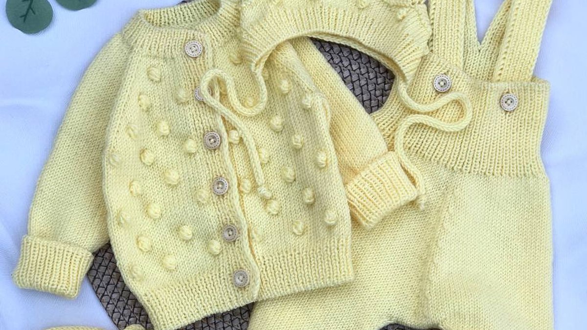Нежный лимонный комплект для малыша включает жакет реглан с «пузырьками», комбинезон с планкой-резинкой и пуговками на лямках, ажурную шапочку с теми же «пупырчатыми» элементами и пару очаровательных пинеток на завязках. Чистое, ровное лицевое полотно подчёркивается фактурой шишечек, а аккуратные резинки удерживают форму. Единый пастельный тон создаёт воздушный, солнечный образ, идеально подходящий для первых фотосессий и уютных прогулок. Видно, что автор старательно контролировал плотность и следил за симметрией деталей – швы малозаметны, пуговицы подобраны в тон. Фото хорошо освещено, текстура пряжи читается, а композиция позволяет рассмотреть каждую вещь.