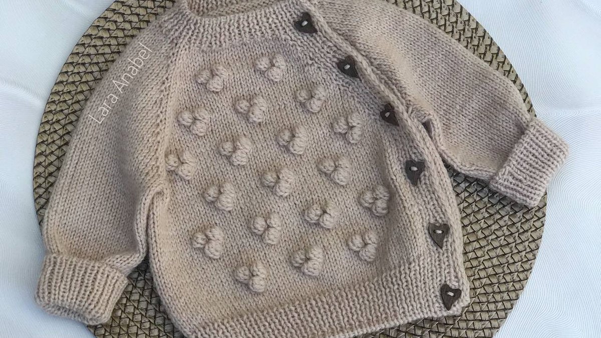 Очаровательный бежевый детский свитер связан регланом сверху вниз и украшен целой россыпью объёмных бобов (шишечек) по передней части – смотрится словно тёплое облачко! Кнопочная планка сбоку на милых сердечках-пуговках облегчает переодевание малыша и добавляет трогательный акцент. Плотная эластичная резинка по горловине, манжетам и низу надёжно держит форму, а нежный оттенок «карамельное пралине» подчёркивает универсальность вещицы. Полотно выглядит ровным, петли аккуратные, а фото позволяет рассмотреть каждую шишечку – видно, сколько любви вложено в работу!