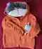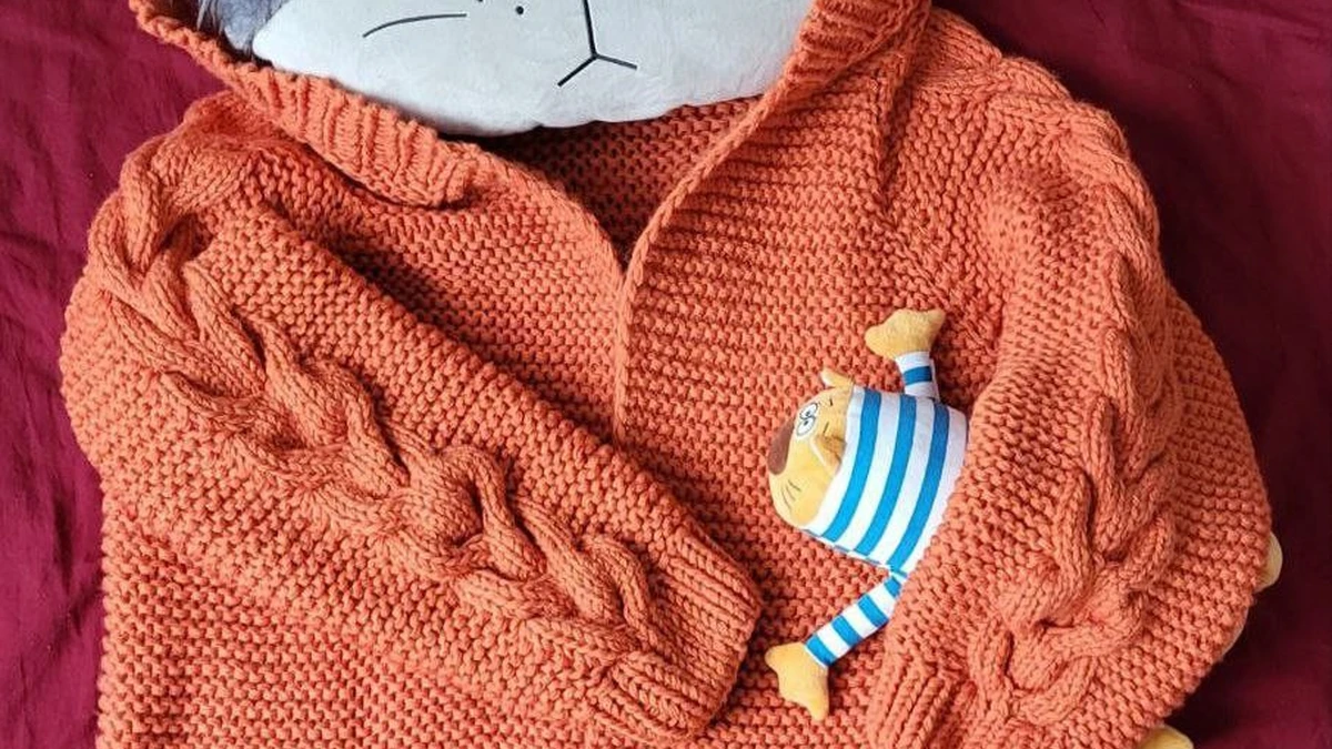 Тёплая детская кофта с капюшоном в сочном «тыквенном» оттенке выглядит очень уютно и по-настоящему носибельно. Фактура основного полотна напоминает рисовую/жемчужную вязку и даёт красивый объём, а рукава украшены выразительными косами — акцент сделан грамотно и без перегруза. Низ и манжеты оформлены резинкой, планки по борту аккуратные, посадка по силуэту выглядит ровной. Игровое настроение добавляют мягкая подушка-кот и маленькая игрушка — получается милый детский сторителлинг.