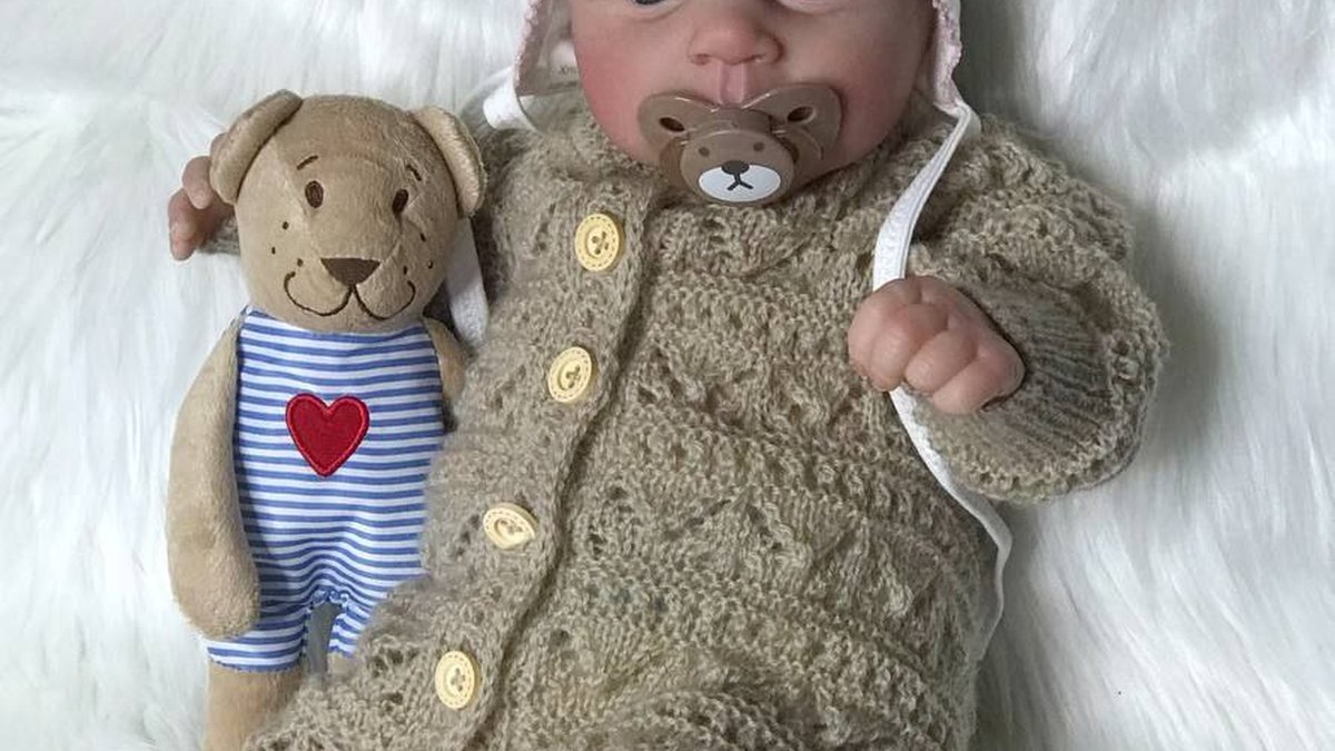 На фотографии вы видите очаровательный детский комбинезон, выполненный в технике вязания спицами. Комбинезон из овечьей шерсти, украшен изящным узором и деревянными пуговицами. Он идеально сочетается с симпатичным белым чепчиком с ушками и нежными розовыми элементами, который добавляет образу игривости и уюта. Вся композиция завершается плюшевым мишкой, который придаёт фотографии гармонию и уют.