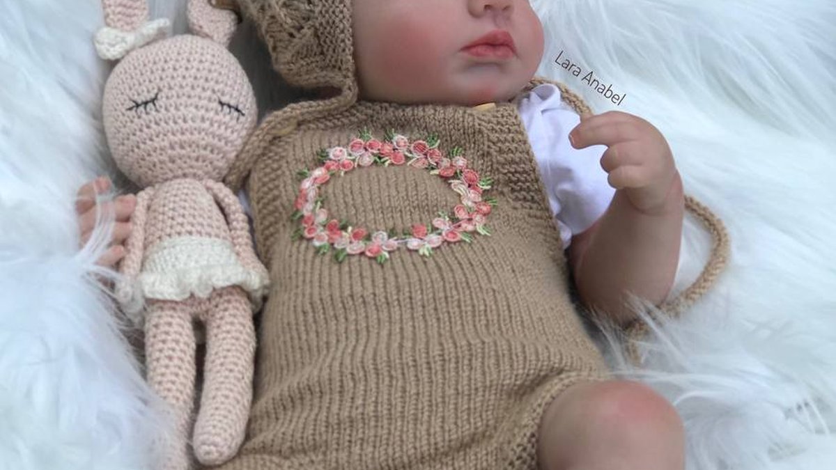 Перед нами нежнейший комплект для младенца: бежевый ромпер, шапочка-капор со сложным рельефным узором и милые носочки-гольфики с оборкой по краю. Центральным акцентом ромпера служит вышитый веночек из крошечных розовых роз с зелёными листочками – изящная деталь, добавляющая романтики. Капор связан резами и переплётами, образующими фактурную «сетку», а завязочки обеспечивают надёжную посадку. Носочки украшены волнистой каймой, подчёркивающей пухлые ножки малыша. Рядом уютно расположился вязаный крючком зайчик амигуруми в пудровых тонах – отличный компаньон для фотосессии. Общая цветовая гамма тёплого бежа и нежно-розового создаёт ощущение умиротворения и комфорта.