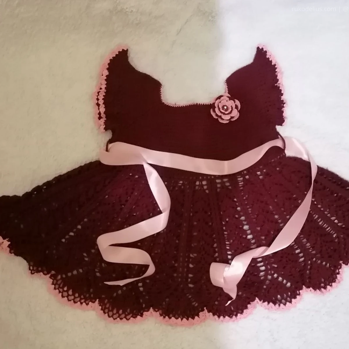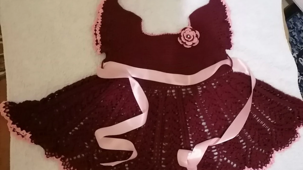 Нарядное детское платьице в оттенке спелой вишни с нежно‑розовыми акцентами выглядит празднично и очень «девочково». Пышная юбка выполнена ажурным узором с красивыми дорожками и фестончатым краем, а лиф лаконичный — чтобы вся выразительность ушла в фактуру и силуэт. Розовая атласная лента на талии и объёмный цветок‑брошь добавляют образу законченности и «тортного» настроения. В целом изделие смотрится аккуратно и опрятно, с хорошей посадкой и удачным контрастом цветов.