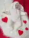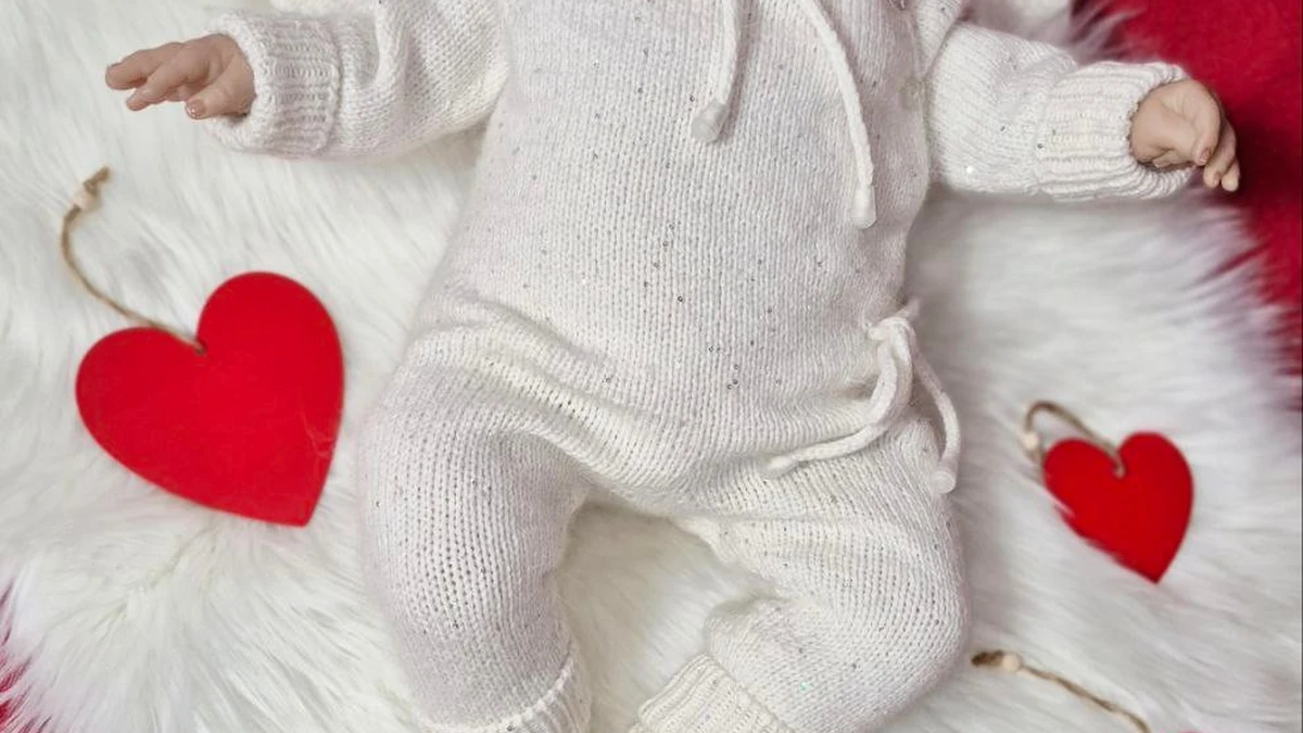 Нежный вязаный комбинезон для малыша в молочно-белой гамме с капюшоном и длинными «зайчьими» ушками выглядит очень уютно и по‑праздничному. Полотно связано лицевой гладью достаточно ровно, манжеты и низ оформлены резинкой, завязки аккуратные, посадка по фигурке смотрится мягко и комфортно. Лёгкая крапинка/мерцание пряжи добавляет деликатный интерес фактуре, а стилизация с красными сердцами делает работу выразительной и продающейся.