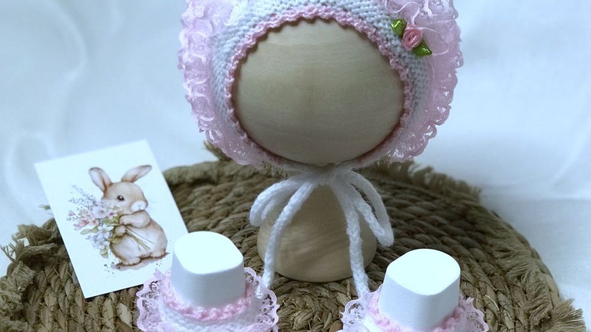 На фото очаровательный комплект для малышки: чепчик и пинетки в бело‑розовой гамме. Основное полотно выглядит выполненным аккуратной платочной вязкой/лицевой гладью с ровным натяжением, края чистые, форма держится хорошо. Главный акцент — нежные розовые рюши по краю чепчика и манжетам пинеток (похоже на декоративную пряжу с готовой оборкой или обвязку), плюс мини‑розочки с листиками как милый «кукольный» штрих. Подача уютная: спокойный фон и реквизит подчёркивают воздушность комплекта.
