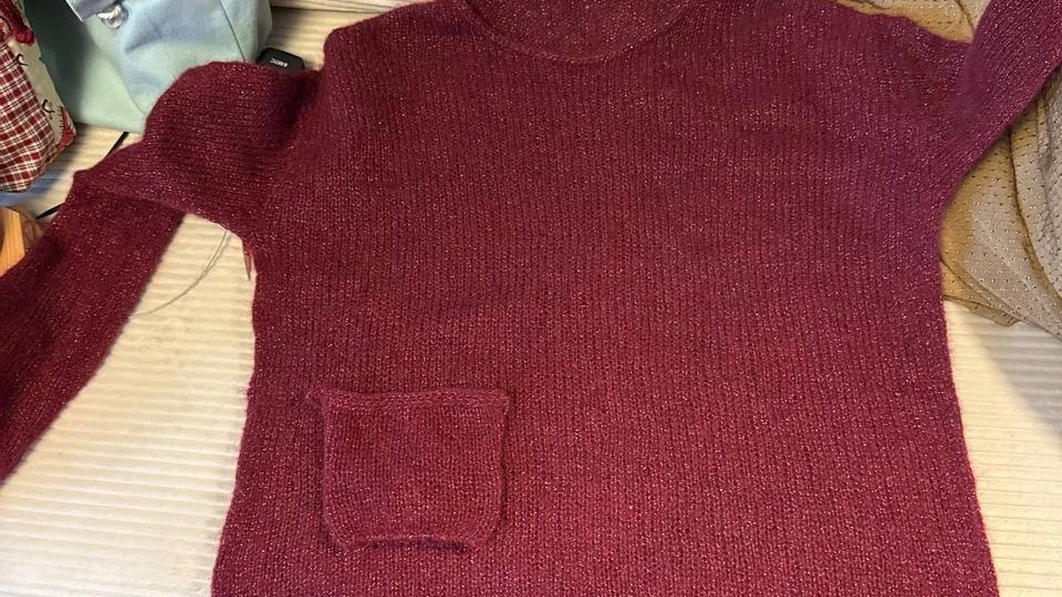 Уютный бордовый джемпер с мягким мерцанием пряжи выглядит тёплым и «носибельным» — именно та вещь, которую хочется надеть в прохладный день. Полотно выполнено ровно, силуэт читается уверенно, аккуратно оформлена горловина. Накладной карман добавляет характер и лёгкую расслабленность, но одновременно требует особенно точной посадки по месту. В целом работа крепкая и практичная: база, которую легко стилизовать и улучшать деталями.