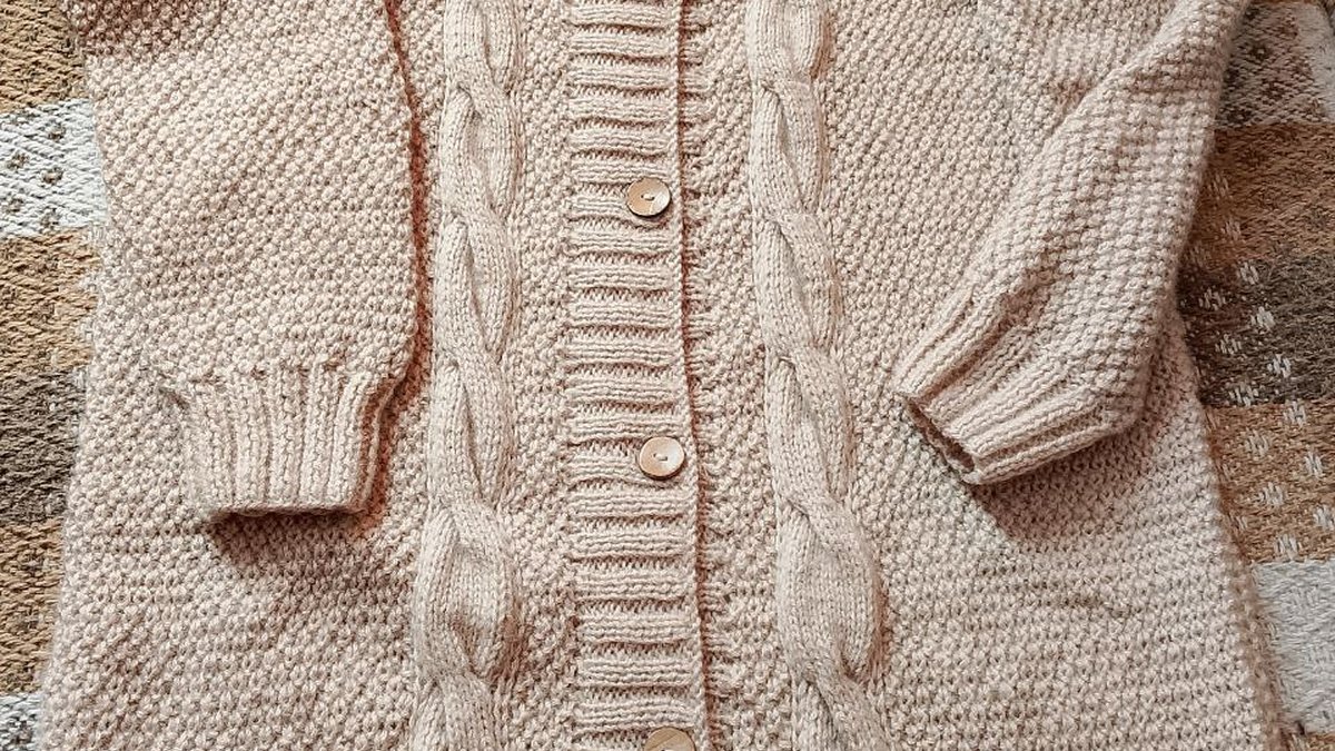 Объёмный кардиган до середины бедра связан из тёплой пудрово-бежевой пряжи. Центральный акцент – две крупные косы «колос» по планке, подчёркнутые фактурой мозаичного (рисового) полотна на полочках и рукавах. Широкая резинка 2х2 по низу изделия и манжетам придаёт форму и не даёт полотну растягиваться. Плотный воротник-стойка, плавно переходящий в планку с аккуратными деревянными пуговицами, завершает уютный образ. Кардиган выглядит добротно и гармонично благодаря единообразной текстуре, ровным петлям и естественной мягкой палитре.