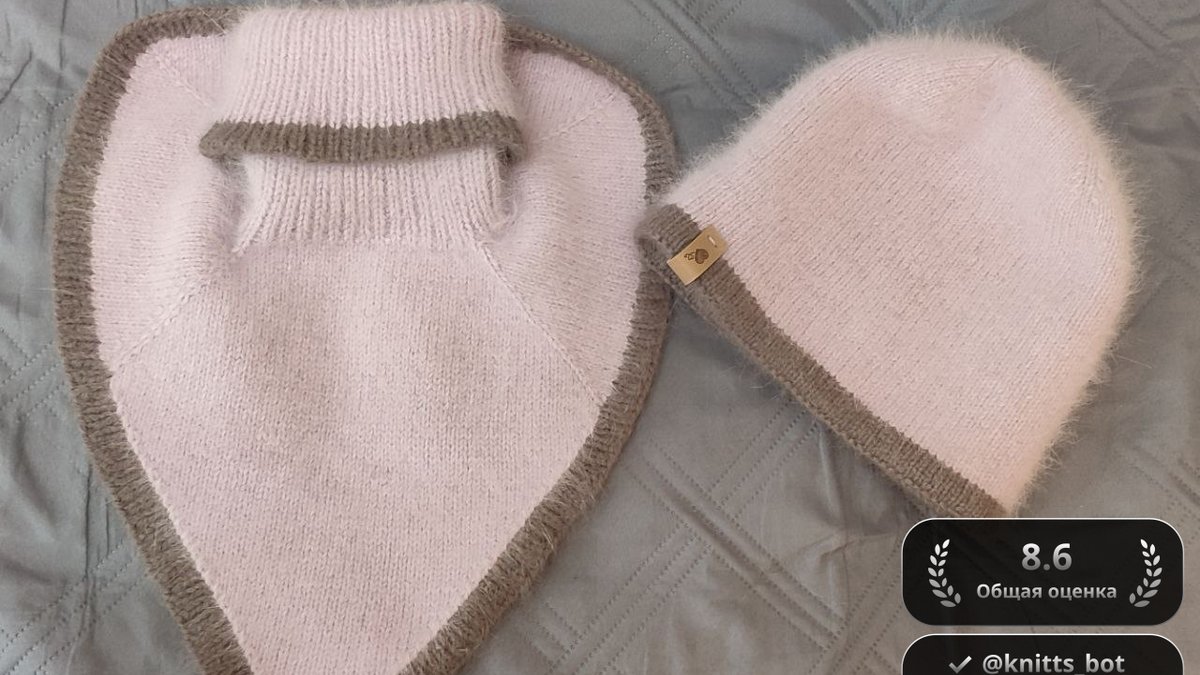 Очаровательный зимний комплект – анатомическая манишка-платок и облегающая шапочка-бини – связан из пушистого пудрово-розового мохера с контрастной какаовой окантовкой. Манишка вывязана сверху-вниз регланом, благодаря чему аккуратно садится на плечи и шею, а мягкая воротничковая резинка 2×2 добавляет уюта. Шапочка выполнена по классической формуле с незаметными убавками по четырём клиньям, что создаёт ровный купол без складок. Оба изделия получились лёгкими как облачко, при этом хорошо держат тепло: дуэт шёлкового кид-мохера и тонкой мериносовой нити даёт деликатный «ореол» и бархатистую посадку. Комплект смотрится минималистично и стильно, отлично подойдёт к пальто пастельных или нейтральных оттенков.