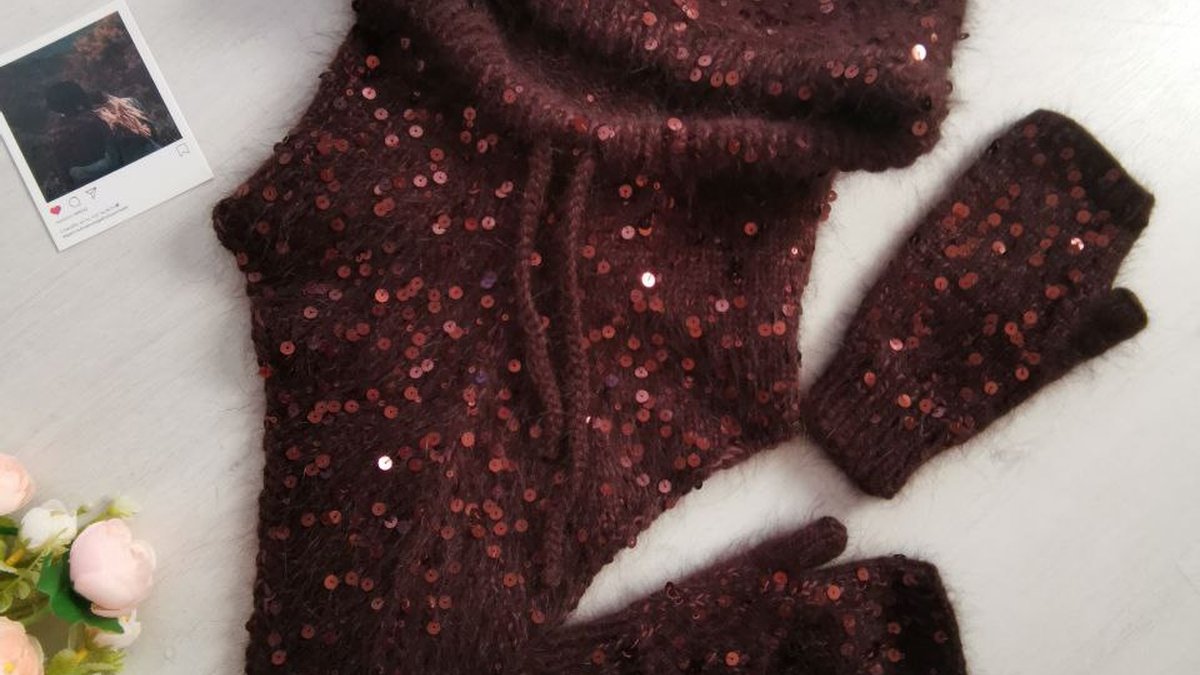 Комплект из пушистого мохера с пришитой лентой пайеток выглядит словно звёздная пыль на бархатном ночном небе. Объёмная удобная балаклава-капюшон плавно переходит в треугольный перед, защищая шею и грудь от ветра, а удлинённая макушка создаёт трендовый силуэт. К нему в тон связаны митенки-гетры: эластичная резинка на запястье, открытые пальцы для свободы движений и блеск пайеток, перекликающийся с головным убором. Глубокий шоколадно-бордовый оттенок подчёркивает богатую текстуру, а мягкий ореол мохера добавляет нежности и тепла.