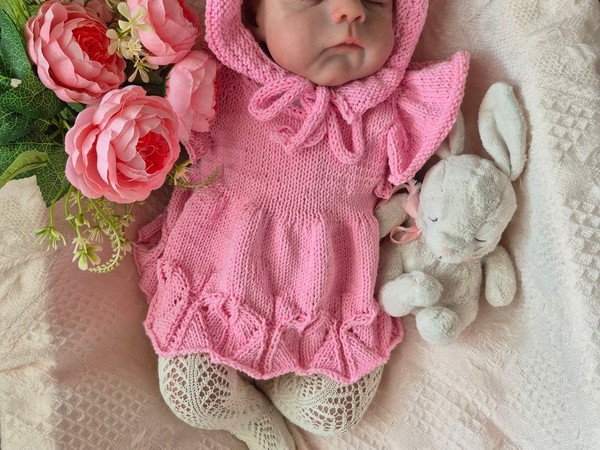 Очаровательный комплект для малышки: лёгкое розово-сиреневое платьице с капюшоном-шлемом, связанное лицевой гладью и украшенное изящным волнистым бордюром с «листочками». Нижний край декорирован широким рельефным узором в виде ромбов и шишечек, который придаёт юбочке приятную фактуру и воздушную сборку. В капюшоне сохранён тот же рельефный край, а мягкие завязки-шнурочки красиво формируют бантик под подбородком. Строчка ровная, петельки аккуратные, плотность изделия выдержана, что особенно важно для детских вещей.