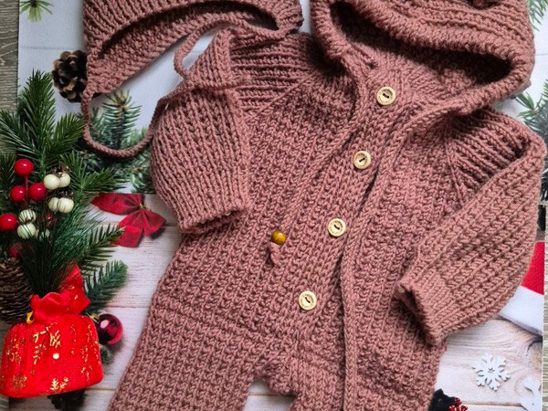 Тёплый вязаный комплект для малыша – уютный комбинезон с капюшоном-ушками и отдельной эльфийской шапочкой в одном благородном розово-пыльном оттенке. Объёмная фактура «вафля» на туловище плавно переходит в эластичную резинку 1х1 на манжетах и штанинах, обеспечивая комфортное прилегание без стягивания. Капюшон украшен двумя мягкими «медвежьими» ушками, которые добавляют очарования, а деревянные пуговицы и бусины подчёркивают натуральность пряжи. Полотно выглядит ровно, петли аккуратны, переходы незаметны – сразу видно опытную руку мастерицы.