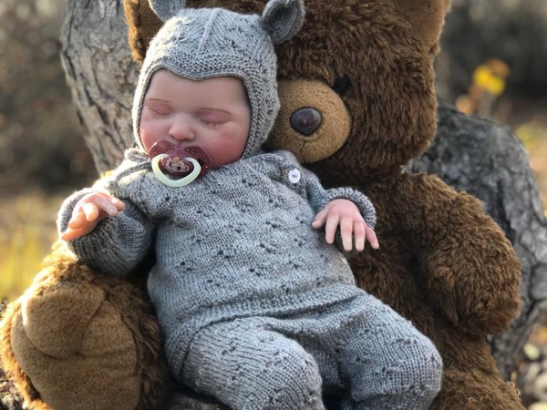 Очаровательный комплект для новорождённого в едином дымчато-сером тоне: цельновязанный комбинезон с нежным «рисовым» узором и мелкими шишечками, плотно облегающие ножки с манжетами-резинками и декоративными шнурами, уютная шапочка-капор с заячьими ушками и мягкие башмачки-носочки. Изделие выглядит очень аккуратным: ровная лицевая гладь, рельефные шишечки распределены симметрично, при этом нет растянувшихся петель или перекосов. Тёплая пряжа средней толщины подчёркивает детский уют, а уши на шапочке добавляют трогательный сказочный акцент. Хорошая фотография на солнечном фоне подчёркивает фактуру, хотя чуть больше переднего света усилило бы детализацию.