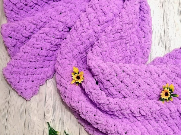 Воздушный, невероятно мягкий плед из объемной плюшевой пряжи насыщенного сиреневого оттенка сразу притягивает взгляд. Рельефный узор напоминает плетение корзинки: широкие «косы» из крупных петель формируют плотную, но при этом пушистую и уютную текстуру. Благодаря крупному размеру и приятной фактуре изделие выглядит как облако, в которое хочется завернуться. Яркий сиреневый цвет контрастно выделяется на светлом фоне пола, а декоративные желтые цветочки добавляют весеннего настроения и подчеркивают сочность гаммы.