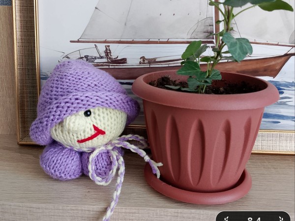Милый маленький гном-осминожек в сиреневой шапочке уютно устроился рядом с цветочным горшком. Круглая кремовая головка связана лицевой гладью по спирали без заметных швов, взгляд создают чёрные бусинки-глазки. Шапочка из фактурной платочной вязки объёмно прикрывает верх, образуя забавный колпак, а восемь коротких лапок-щупалец аккуратно вывязаны чулочной вязкой с ровной плотностью. Завершают образ скрученные шнурочки-усики двух оттенков – сиреневого и молочного, добавляющие динамики и игривости. Простая, но аккуратная работа, которая радует нежной цветовой гаммой и дружелюбной улыбкой.