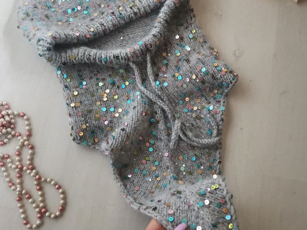 Капор связан по кругу снизу вверх на круговых спицах 4 мм из пряжи с вплетёнными пайетками. Для начала набрано эластичным длинным хвостом 96 петель, затем провязано 8 кругов резинкой 1×1, создавая мягкий, но плотный нижний край манишки. После перехода на лицевую гладь выполнялись прибавки вдоль двух боковых линий реглана, формируя расширение на плечи. По достижении высоты груди петли соединены в круг, чтобы сформировать трубу капора. На уровне подбородка часть петель закрыта, образуя носик-хоботок, который затем убавками «k2tog» сокращается до одной петли и фиксируется иглой. От края лица петли подняты крючком по принципу «pick-up and knit», провязано 6 кругов лицевой глади и закрыто иглой трикотажным швом, формируя аккуратную подворотную бейку. Шнурок-кулиска выполнен методом ай-корд на пяти петлях длиной 70 см и протянут по перфорации в первом ряду бейки. По всей поверхности полотна равномерно распределены блестящие пайетки диаметром 4 мм, пришитые по мере вязания, что обеспечивает прочную фиксацию и ровное свечение. Завершающая влажно-тепловая обработка через влажное полотенце стабилизирует форму и раскрывает пушок пряжи.