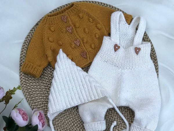 Очаровательный детский комплект из трёх вещей мгновенно покоряет сердце: карамельно-горчичный жакет с рельефными «шишечками» и милыми пуговицами-сердечками, нежный сливочный ромпер на лямках с аналогичными кожаными сердечками и треугольная шапочка-эльф из упругой английской резинки. Тёплая фактура полушерстяной пряжи, плавные линии реглана и ровное лицевое полотно создают ощущение уюта и заботы. Контраст тёплого горчичного и чистого белого подчёркивает современный сканди-шик, а аккуратные детали придают комплекту авторский шарм.