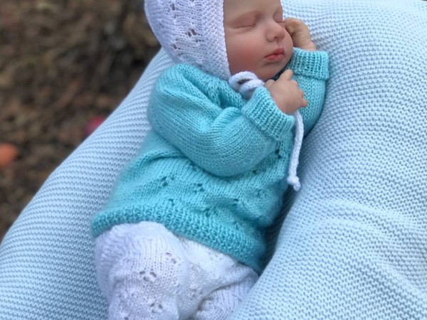 Нежнейший комплект для новорождённого: ажурная белая шапочка-капор с забавными «зайчьими» ушками, бирюзовый джемпер лицевой гладью с изящными ажурными точками и белые ажурные штанишки. Мягкая пряжа подчёркивает чувственный образ спящего малыша, а цветовое сочетание бирюзы и белоснежного кружева придаёт работе воздушность. Аккуратные убавки на макушке, ровный край ай-кордом на завязках и безупречная резинка на манжетах говорят о хорошем уровне техники и любви к деталям.