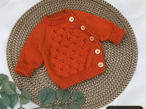 Очаровательная детская кофточка регланом сверху связана гладкой лицевой гладью с ажурными «дырочками-капельками» по переду. Тёплый терракотовый оттенок подчёркивается натуральными деревянными пуговицами, расположенными асимметрично по боковой планке ‑ эффектно и удобно при переодевании малыша. Аккуратные манжеты и резинка по горловине выполнены эластичной 1×1, швы отсутствуют: полотно выглядит ровным, с отличным контролем натяжения. Фото хорошо освещено и демонстрирует изделие целиком, а круглая циновка на фоне добавляет стильную рамку кадру.