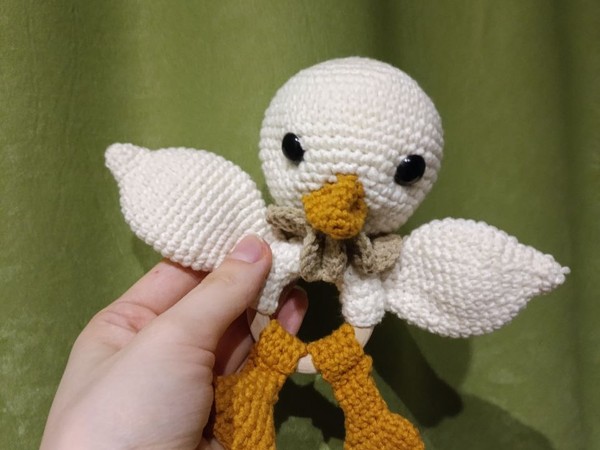 Вязание крючком в технике амигуруми по спирали: основа — столбики без накида (сбн) с прибавками/убавками для формирования шара головы и вытянутых деталей (крылья, лапки). Голова связана плотным полотном с равномерным шагом прибавок (классическая схема «6-12-18…»), что даёт гладкий округлый объём. Для аккуратного вида вероятнее всего использованы невидимые убавки (invdec) — они минимизируют «дырочки» на местах сужения. Крылья выполнены отдельными деталями: сначала цепочка воздушных петель или кольцо амигуруми, далее расширение прибавками и лёгкая асимметрия по краю, чтобы получить «листик». Лапки связаны более рыхло/рельефно за счёт подбора пряжи и плотности: сбн по спирали с расширением внизу, что создаёт «перепончатый» силуэт. Клюв — небольшая объёмная деталь на основе шара/конуса с аккуратным пришиванием по периметру. Сборка выполнена пришиванием деталей потайными стежками; «воротничок» у шеи напоминает рюшу, связанную из сбн/полустолбиков с накидом с прибавлениями для волны. Деревянное кольцо обвязано/зафиксировано в конструкции как держатель — при желании внутрь головы можно добавить шуршащую вставку или гремелку (важно надёжно изолировать).