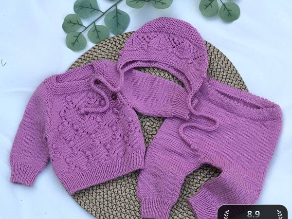 Милейший трёхпредметный комплект для малыша: реглан-свитер с ажурными «шишечками», шапочка-капор с листочками по краю и ползунки на кулиске. Ровная лицевая гладь и фактурные элементы образуют нежную, но выразительную игру текстур, а единый пудрово-сиреневый оттенок придаёт ансамблю цельность. Капор украшён аккуратной ай-корд завязкой, манжеты и низы связаны эластичной резинкой 1×1, что удобно для активного ребёнка. Фото чёткое, предметы разложены на контрастной циновке и фоне, декор из эвкалипта добавляет лёгкой эко-нотки.