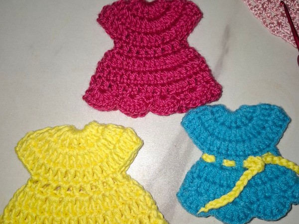 Три мини-платья-аппликации связаны крючком из яркой акриловой пряжи: малиновое с фурнитурой под брелок, лимонно-жёлтое и бирюзовое с жёлтым пояском. Рельефные «ракушки» по нижнему краю создают игривый волнистый подол, а круглые кокетки вырисовываются за счёт прибавок в каждом ряду. Петельки ровные, плотность стабильная, цвета жизнерадостные и отлично сочетаются. Маленький размер делает изделия милыми сувенирами – их можно подвесить к сумке, ключам или использовать как нашивку на детскую одежду.