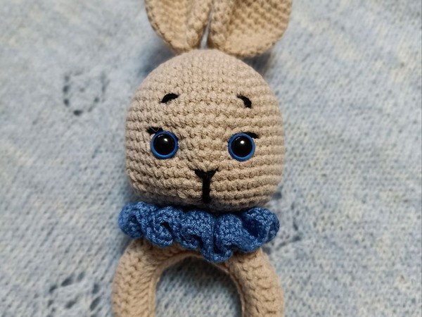 Очаровательная вязаная погремушка-прорезыватель в виде кролика: аккуратно сформированная бежевая головка с выразительными синими глазками, вышитыми бровками и носиком. Длинные подвижные ушки добавляют мимики, а волнистый синий жабо подчёркивает контраст и придаёт игрушке праздничность. Ручка выполнена на деревянном кольце, надёжно обвязанном тем же хлопком, чтобы малышу было приятно держать. Столбики ровные, плотные, без просветов – видно уверенное владение крючком и заботу о безопасности ребёнка.