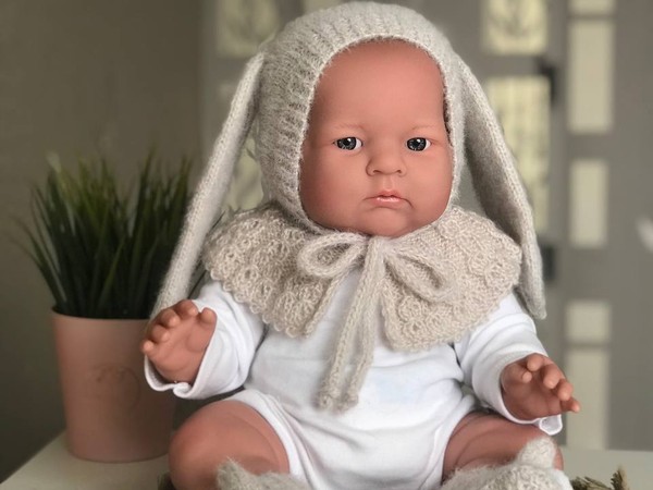 На фото — очаровательный вязаный комплект для малыша в нежном бежево-кремовом оттенке: шапочка-капор с длинными «зайчьими» ушками, воздушная пелеринка/воротничок с ажурным краем и мягкие пинетки с помпонами. Фактура пряжи пушистая, «облачная», из-за чего изделие выглядит особенно уютным и фотогеничным. Посадка капора аккуратная, завязки выполнены ровно, отделка по краю смотрится деликатно и по-русски нарядно. Снимок хорошо поставлен: мягкий свет, спокойный фон и фокус на изделии подчёркивают ручную работу.