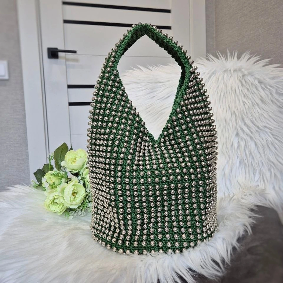 Эффектная сумка-«хобо» глубокого изумрудного оттенка, полностью усыпанная металлическими бусинами — вещь с ярким вечерним характером и отличной посадкой по форме. Полотно плотное, держит объём, ручка аккуратно выведена без явных перекосов. Бусины уложены ровной «сеткой», за счёт чего поверхность выглядит как ювелирная кольчуга. Сочетание зелёного и холодного серебра работает очень выигрышно: аксессуар выглядит дороже своей себестоимости и точно притягивает взгляд.