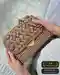 Сумочка выполнена в технике тунисского вязания крючком, что придает ей плотность и текстуру. Используется толстая крючковая пряжа, которая создает объемные стежки. Благодаря повторяющимся элементам узора, изделие приобретает слегка колючую поверхность, что добавляет ему дополнительное тактильное ощущение. Тунисское вязание позволяет соединить классический вид вязания с плотностью полотна. Кроме того, для создания объемного эффекта применяется вязка с большим количеством петель, что способствует прочности конструкции. Акцент в виде золотой цепочки и металлической застежки добавляет элемент роскоши и превращает сумочку в модный аксессуар, подходящий для вечерних прогулок и особых событий.