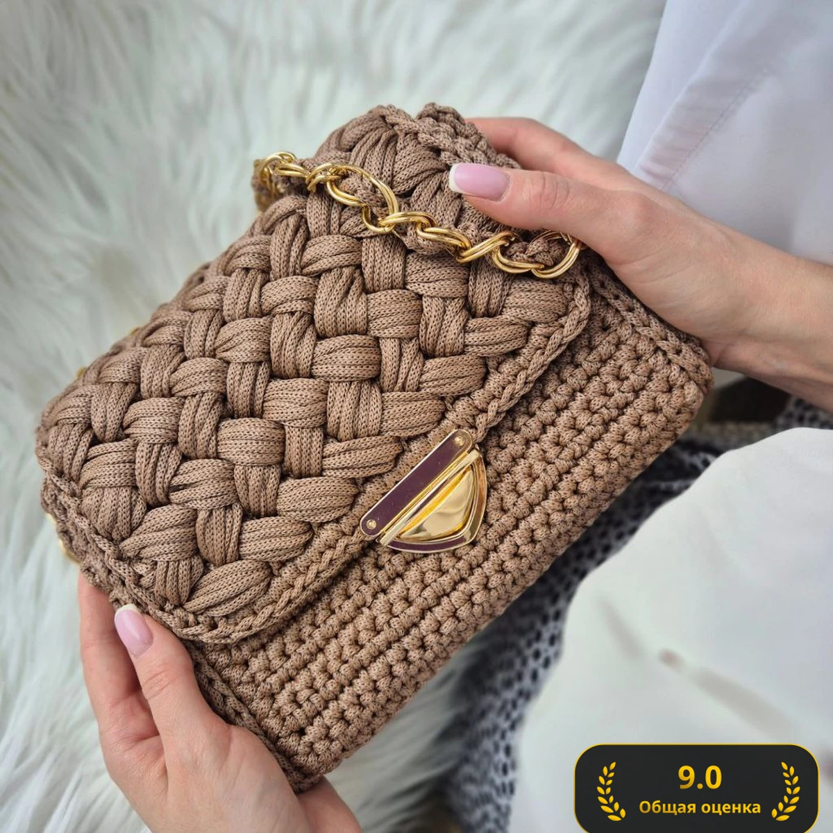 Эта сумочка связана с использованием крупной пряжи, что придает ей текстурированный и стильный вид. Золотая цепочка и застежка добавляют шикарного акцента, превращая её в стильный аксессуар, подходящий для различных случаев. Очевидно, что это изделие было создано с вниманием к деталям, что отражается в аккуратных стежках и продуманной конструкции.