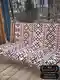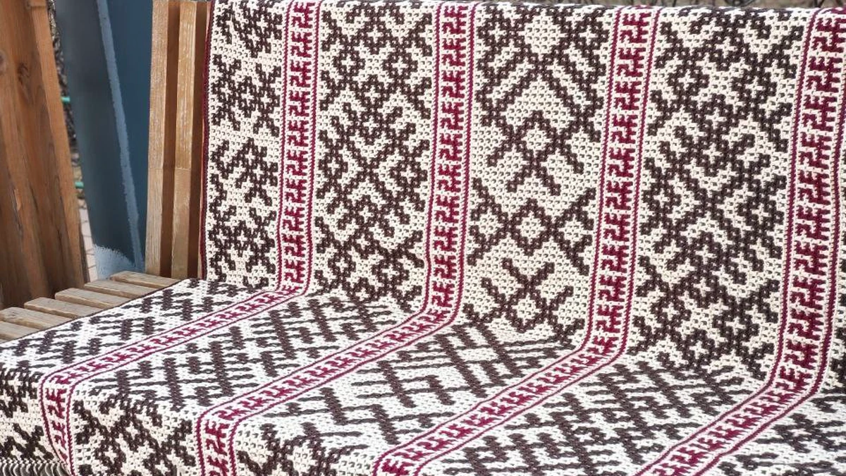 Этот замечательный плед с этническими узорами украшает деревянную скамью, придавая ей уютный и традиционный вид. Его уникальный дизайн комбинирует три цвета: тёплый натуральный белый, бордовый и глубокий коричневый, создавая привлекательный контраст. Фактура вязания выглядит прочной и очень аккуратной, а бахрома придаёт завершённость всей композиции.