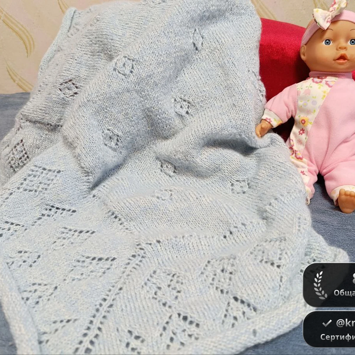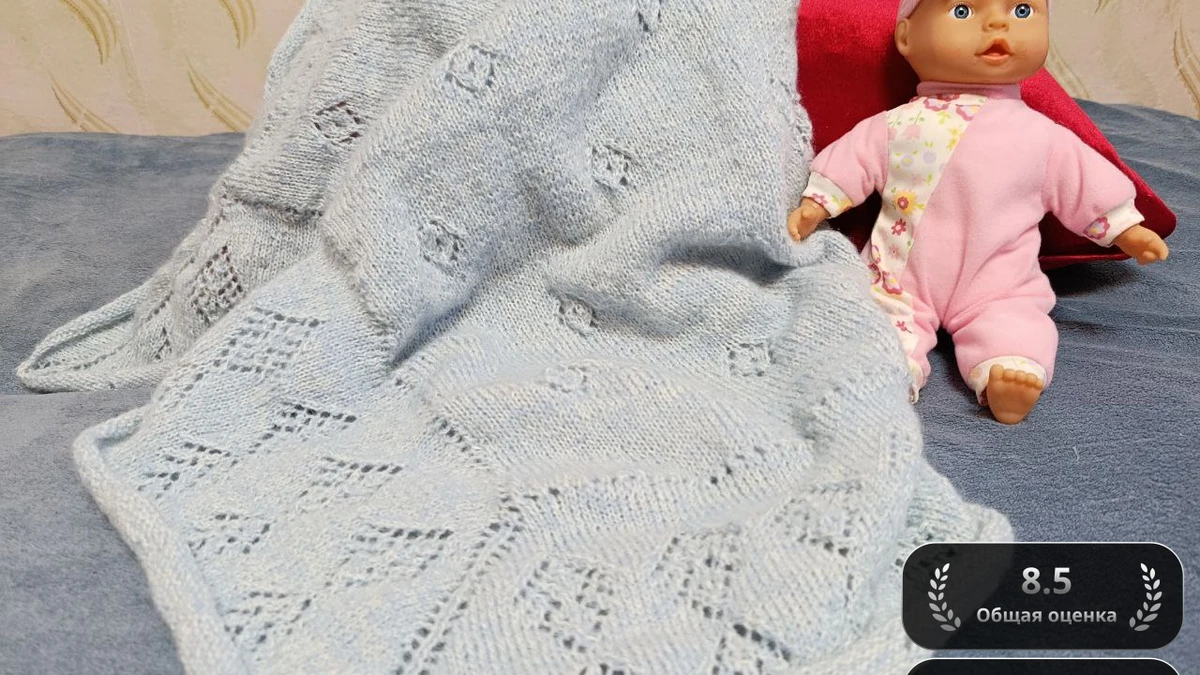 Нежный голубой детский плед со сквозными ромбами и маленькими цветочными дырочками выглядит уютно и воздушно. Мягкая пряжа придаёт полотну деликатный пушок, а ажурные вставки образуют красивый геометрический рисунок, подчёркивая аккуратность лицевой глади. Плед аккуратно обвязан айкордом по периметру, что предотвращает скручивание краёв и добавляет завершённости. Игрушечная кукла рядом помогает оценить масштаб — полотна явно хватит, чтобы укутать малыша в коляске или кроватке. Общий образ спокойный и трогательный, отлично подходит для новорождённого.