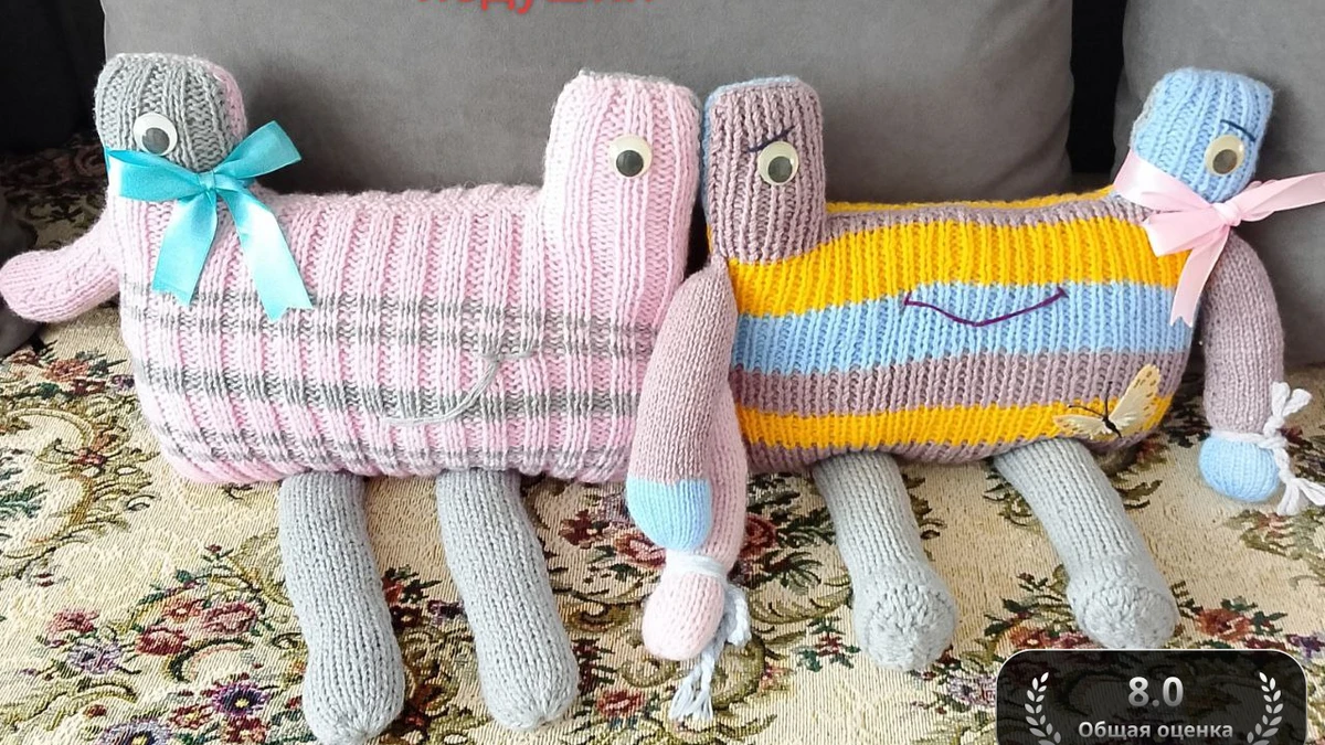 Эти подушки выполнены с помощью спиц, используя технику лицевой глади. Подушки имеют форму забавных существ, напоминающих фантастических инопланетян. Для создания основной формы использованы простые прямоугольники, которые затем дополняются объемными "ногами" и "головами" с глазами-бусинами. Вязание выполнено с использованием нескольких цветов, в том числе пастельных и ярких тонов, что требует тщательной смены нитей и аккуратного управления цветами, чтобы избежать путаницы и нежелательных узлов. Техника вязания включает чередование лицевых и изнаночных петель для создания полосатого рисунка, а также использование различных цветовых блоков для создания выразительных узоров. Глаза созданы с использованием больших бусин или пуговиц, что добавляет подушкам характерный ребёнокоподобный вид.