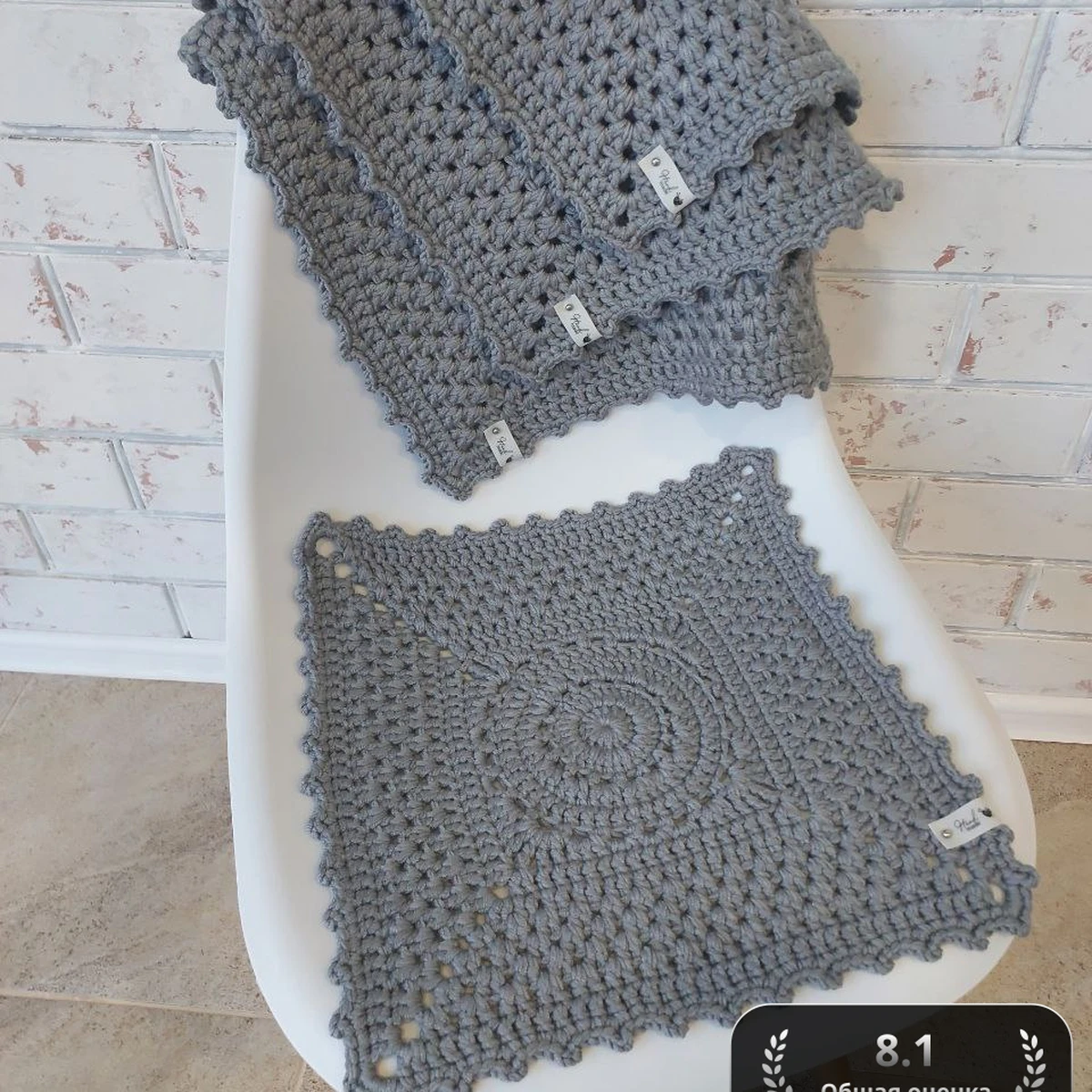 На фотографии изображено стильное вязаное покрывало и коврик, выполненные крючком. Их нейтральный серый цвет делает их универсальными и подходящими для любого интерьера. Узор с кольцевыми мотивами добавляет текстуру и интерес, а края с аккуратным обрамлением завершают общий вид изделия. Подобная работа прекрасно подойдет для уютного уголка в вашем доме.